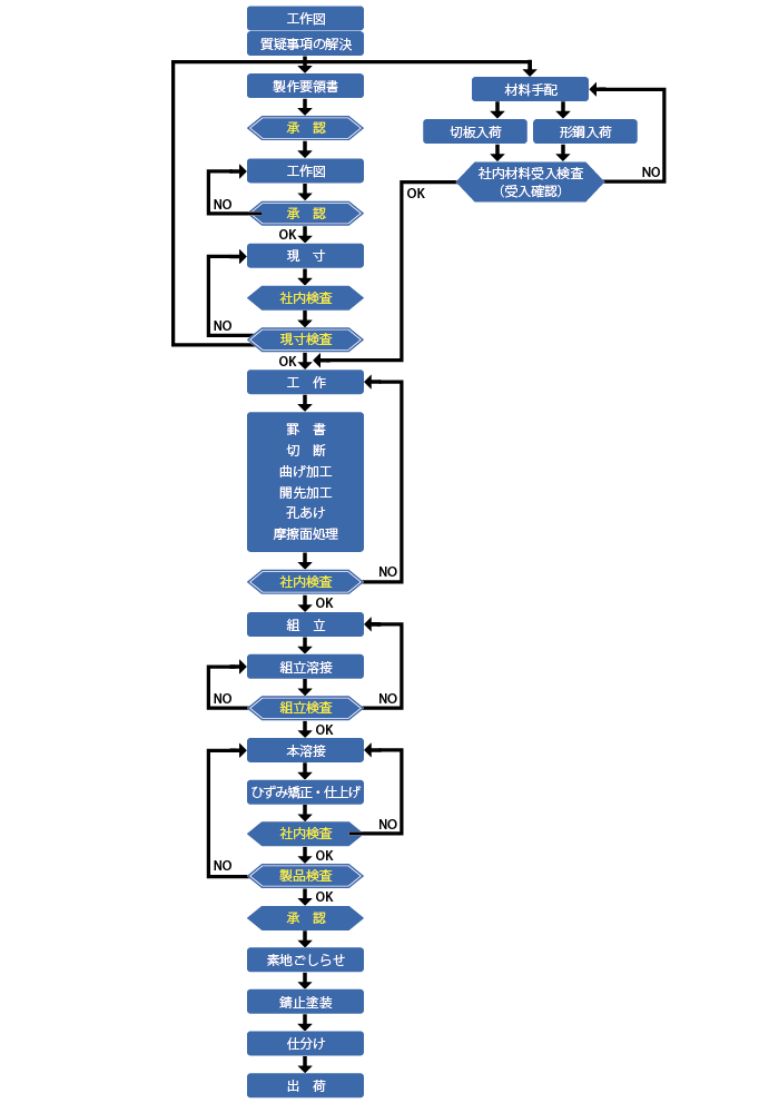 特に注目すべきは、主要な製造工程(工作図確認後の製作、加工、組立て、ひずみ矯正後)の直後に必ず【社内検査】を配置している点です。部材の【寸法検査】はもちろん、組立て後の【製品検査】に至るまで、人の目と機械の測定による二重のチェックを義務付けることで、不良品の次の工程への流出を未然に防ぎ、最終品質を保証します。