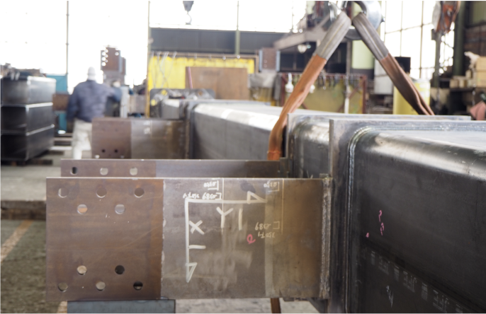材料手配後の【社内材料受入検査】から始まり、【切断】、【開先加工】、そして【ショットブラスト】による表面処理まで、工程図には最新鋭の設備と熟練の技術が詰まっています。この明確な工程策定と各工程の見える化により、作業時間の均一化と品質の安定化を実現。お客様に常に安定した高品質な鉄骨を提供できる仕組みとなっています。